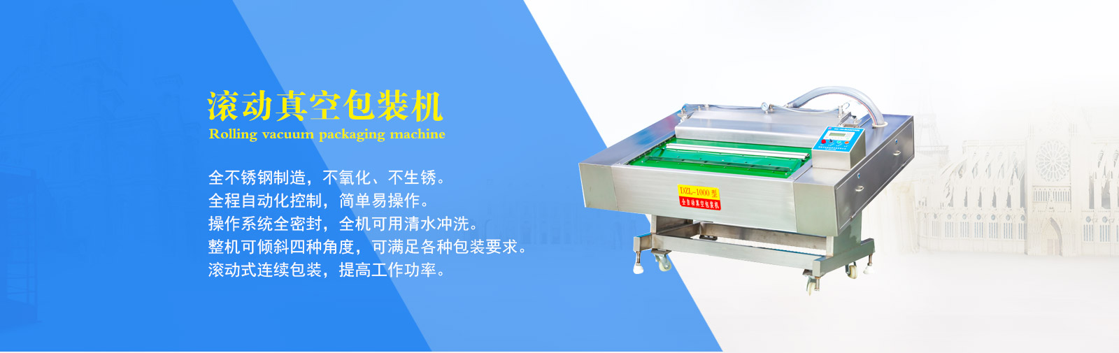 公司專業(yè)制造生產(chǎn)真空包裝機、拉伸膜真空包裝機、盒式真空包裝機、斬拌機、滾揉機、鹽水注射機、巴氏殺菌流水線等食品機械。其中生產(chǎn)的DZL-420全自動拉伸膜真空包裝機、DZL-1000型連續(xù)自動真空包裝機、真空滾揉機、斬拌機、鹽水注射機等都是通過本市技術(shù)監(jiān)督局檢驗合格的產(chǎn)品。
